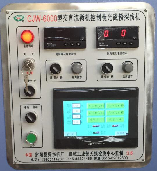 一、主要技術指標:周向磁化交流電流AC:0—6000A(有效值)連續可調,帶斷電相位控制(無漏檢)。周向磁化直流電流DC:0—6000A(有效值)連續可調,帶斷電相位控制(無漏檢)。縱向磁化磁勢AC:0—18000AT(有效值)連續可調,帶斷電相控制(無漏檢)。電極間距:0—1500mm。磁化原理:通電、線圈法。磁化方式:周向磁化、縱向磁化、復合磁化三種可靈活選用。使用環境:—10℃—+40℃,相對濕度≤80%。貯存環境:溫度—20℃—60℃,相對濕度≤70%。無腐蝕性氣體粉塵和強力高頻電磁污染。紫外線強度:距工件380mm處紫外線強度不少于4000μW/cm2。靈敏度測試:按中華人民共和國機械行業標準JB/T6065—92《磁粉探傷用標準試片》規定,以標準2號A型試片測試,顯示清晰。電源:三相四線,380V±20%,50HZ,約250A。檢查面:工件全部表面的裂紋等缺陷。退磁:AC18000—0(有效值)衰減式自動退磁。剩磁:Br≤0.2mT。工件旋轉觀察速度:4-6rpm。磁化線圈:內徑450mm。線圈移動方式氣缸自動伸出。氣動夾緊:夾緊行程0-100mm。線圈伸出氣缸行程0—350mm.氣源氣壓: 0.4—0.8MP。磁化電源柜尺寸:620*500*1750,夾持裝置尺寸:3500*800*1400(不包括暗室)設備重:1.8T