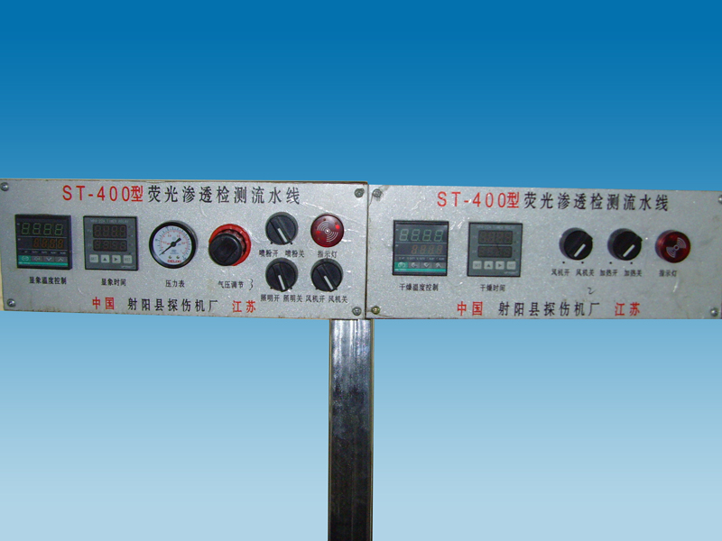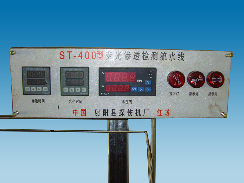 滲透檢驗(yàn)是將一種含有熒光物質(zhì)的滲透劑涂覆在零件表面上,在毛細(xì)作用下,滲透劑滲入表面的缺陷中去,然后去除掉零件表面上多余的滲透劑,再在零件表面涂上一薄層顯像劑,缺陷中的滲透劑在毛細(xì)作用下重新被吸附到零件表面上來(lái)而形成放大了的缺陷顯示,在黑光燈下(熒光檢驗(yàn)法)觀察缺陷顯示。滲透檢驗(yàn)的基本步驟是滲透,乳化,清洗,干燥,顯像和檢驗(yàn)。設(shè)計(jì)制造依據(jù)及檢驗(yàn)標(biāo)準(zhǔn):按HB/Z61-98《滲透檢驗(yàn)》標(biāo)準(zhǔn),按GE公司工藝規(guī)范,美國(guó)ASTME165,ASTME1417《滲透檢驗(yàn)》標(biāo)準(zhǔn)、GB2617-92《試驗(yàn)機(jī)通用技術(shù)要求》標(biāo)準(zhǔn)。該線(xiàn)主要有實(shí)用、耐用、高效、穩(wěn)定可靠等優(yōu)點(diǎn)。熒光滲透探傷流水線(xiàn)主要包含以下幾個(gè)工藝流程:前清洗 …… 滲透 …… 乳化 …… 清洗 …… 干燥 …… 顯像 …… 觀察檢驗(yàn)。