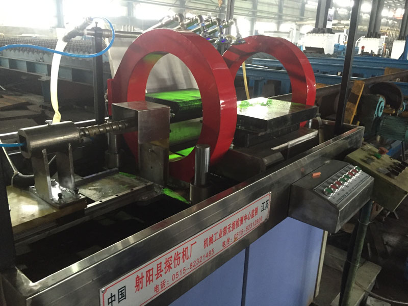 一、主要技術參數:1.1、磁化方式:周向、縱向兩種磁化方式,內孔穿棒感應磁化。1.2、周向磁化磁勢:AC 0~20000AT有效值,連續可調,帶斷電相位控制;1.3、縱向磁化磁勢:AC 0~20000AT有效值,連續可調,帶斷電相位控制;1.4、暫載率:≥30%;1.5、最大檢測外徑:115~280mm;1.6、工作方式:手動和自動;1.7、探傷靈敏度: A1型15/50(30/100)試片顯示清晰;1.8、退磁方式:自動衰減式退磁;1.9、周向退磁磁勢:AC 20000~0AT有效值,數顯連續可調;1.10、縱向退磁磁勢:AC 20000~0AT有效值,數顯連續可調;1.11、退磁效果:≤0.5mT;1.12、工作節拍:每端磁化時間約25秒/件(探傷時序可編程調整);1.13、電源:三相四線 380V±10% 50Hz 瞬時最大30A;1.14、外形尺寸:主機約1800(L)×800(W)×1650(H)mm;電源控制柜約600(L)×450(W)×1850(H)㎜;1.18、重量:1500kg。二、設備主要組成:
